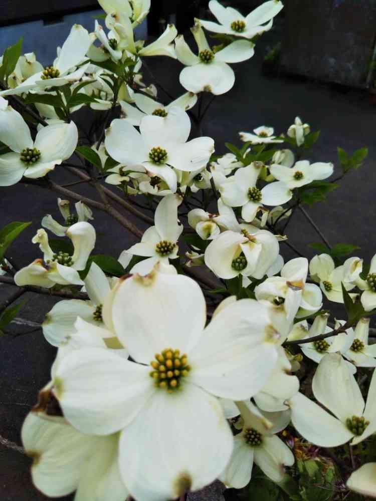 ハナミズキです🌼昨年まで余り咲かず、咲いても数輪、咲かせ方🤷♂️、👱に肥料不足と言われ、退職してから田植え手伝いして四年、その時使っている液体肥料の残り物に、水いれやったら参りました🤗満開です。👱さすが物知りです、👴上がりません下るだけの人生を知って納得してます。結婚3?年記念樹ではないが😃昨日夕方撮影三投稿目、寒くてお外出れません。エアコン暖房オン🔛花黒いのがわかりません🤔