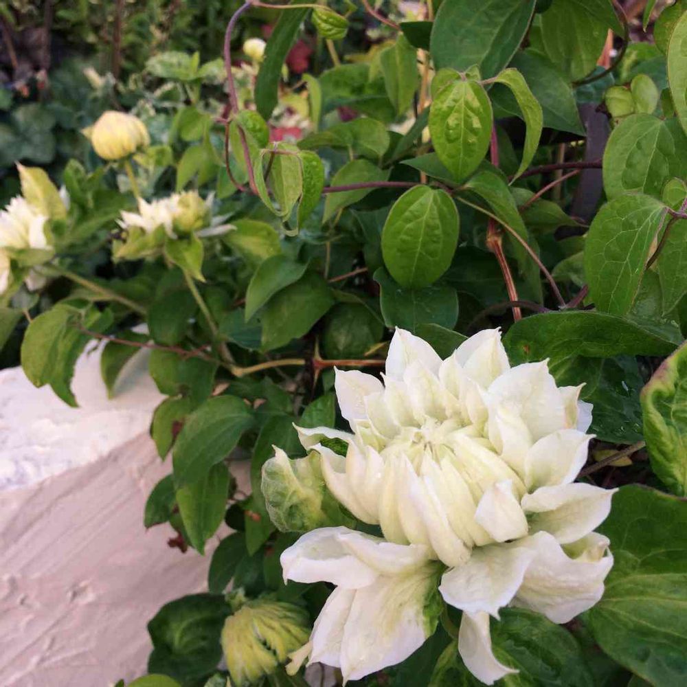 クレマチス 白の八重 エジンバラ咲きました♡ いやーやはりかわゆい(〃ω〃) 蕾のわくわく感がたまらないけど咲くとやっぱり嬉しいですね(p*'v`*q)
