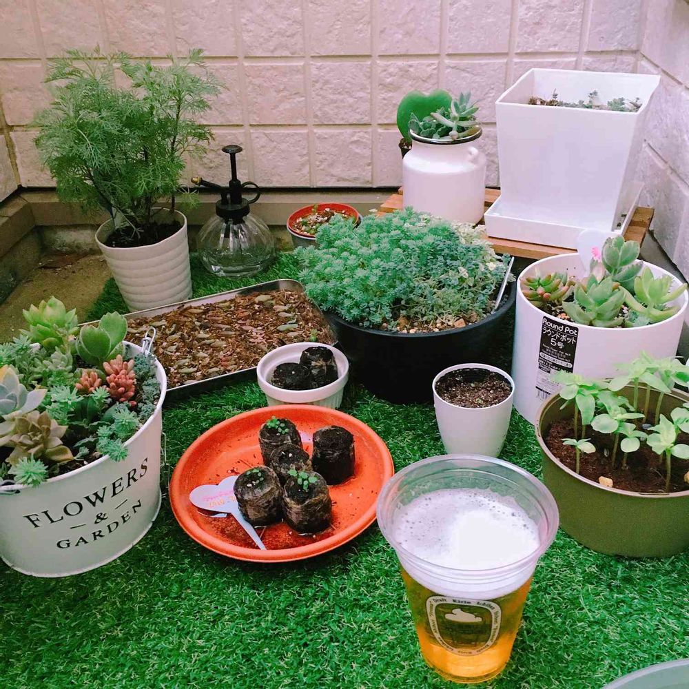 芝に座って育てている植物たちを眺めながらお昼にビールを飲む…至福すぎるひととき🍺♥