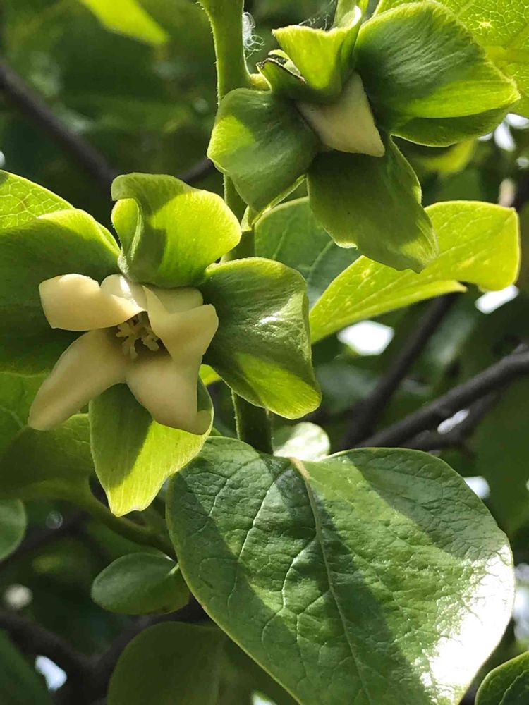 鶴見川沿いの遊歩道傍で、ようやく、開花中の柿の花に遭遇。