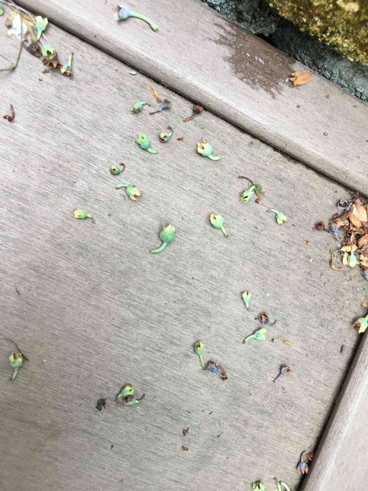 今日気がついたのですがブルーベリーの木の下に小さな実が切られて沢山落ちていました。