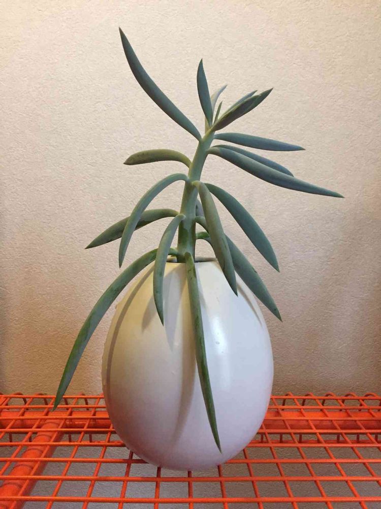 水差しで発根中のセネシオさん。卵型の花瓶に付けておいてたら、淵にぴったり沿うように葉っぱが降りてきた😳
