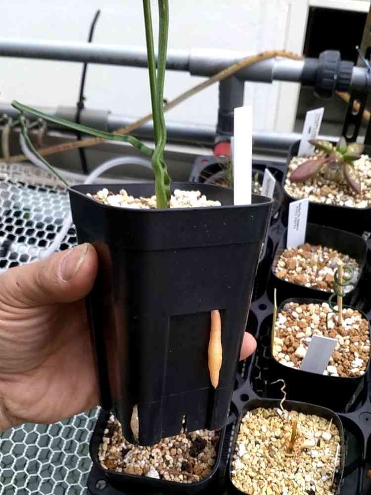 他の鉢に隠れてて全く気が付かなかったけど、トラキアンドラ トルチリスの根っこがプレステラの横向きのスリットから脱走中😲