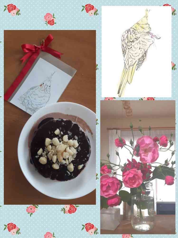 母の日に娘がチョコレートケーキとペットのオカメインコの似顔絵をフォトカードにしてくれました✨ 😂