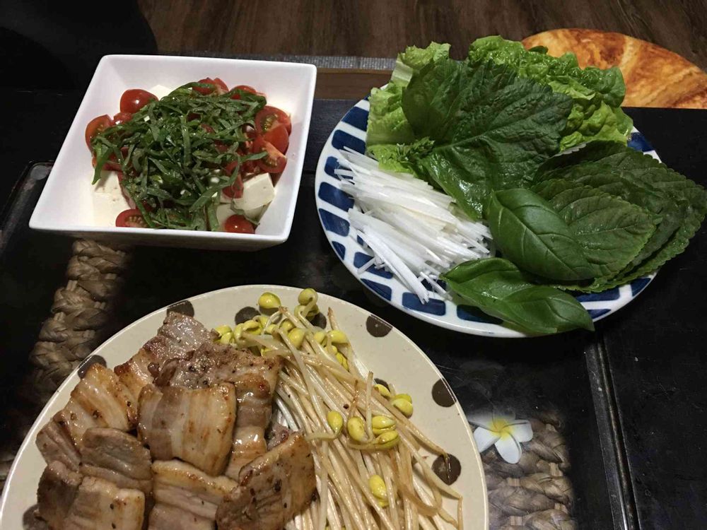 今日は、うちで収穫したエゴマと青じそとバジルを使ってサムギョプサルを作りました😋