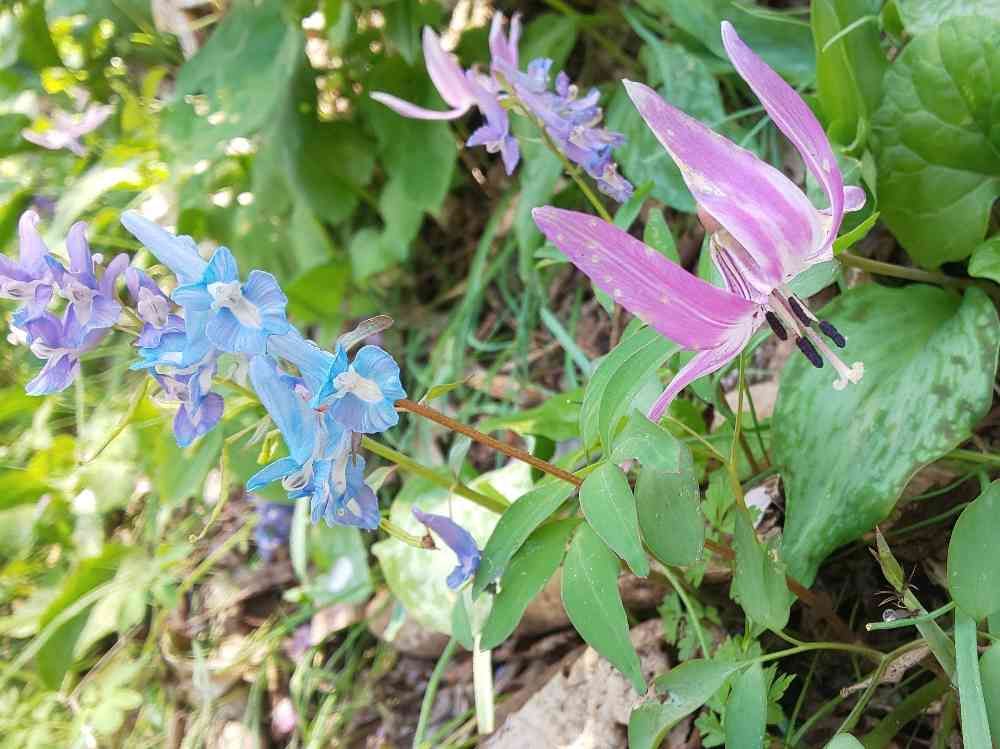 カタクリの花。後ろに咲いている花はエゾエンゴサクです。北海道に咲く春の花です。