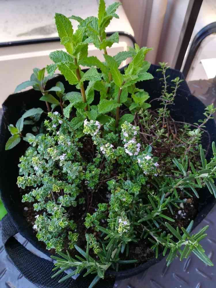 右のローズマリーと後ろのスペアミントはわかりますが手前の小花があるのはわかりません。