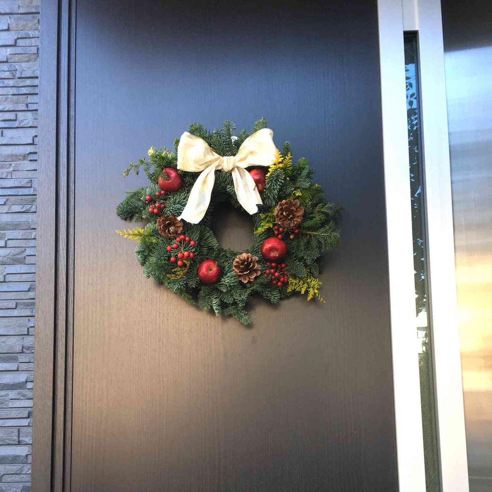生のリース、玄関に飾りました。良い香り❤️。ヒバの黄色が綺麗です。