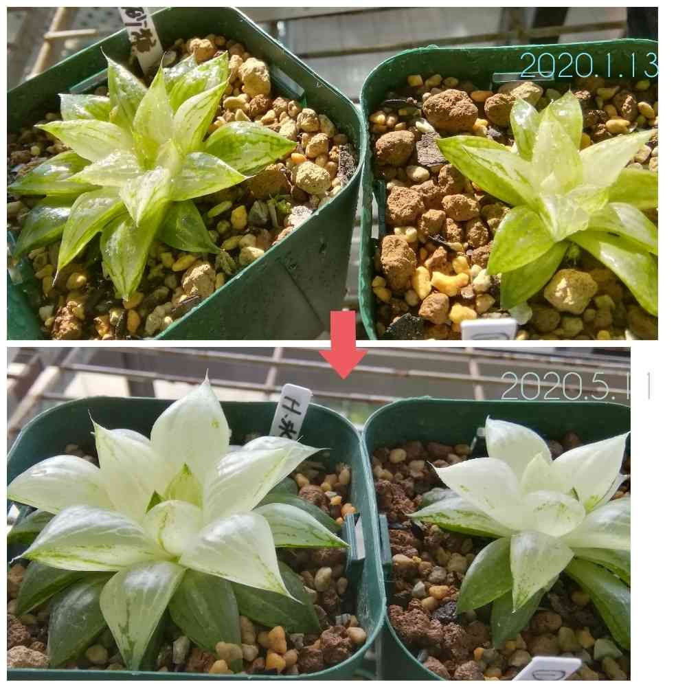 1号の子株1月と現在。成長期なだけあってムッチムチ、水分を含んで白さが増しました。中心部分にちゃんと緑が出てきてくれて一安心です。