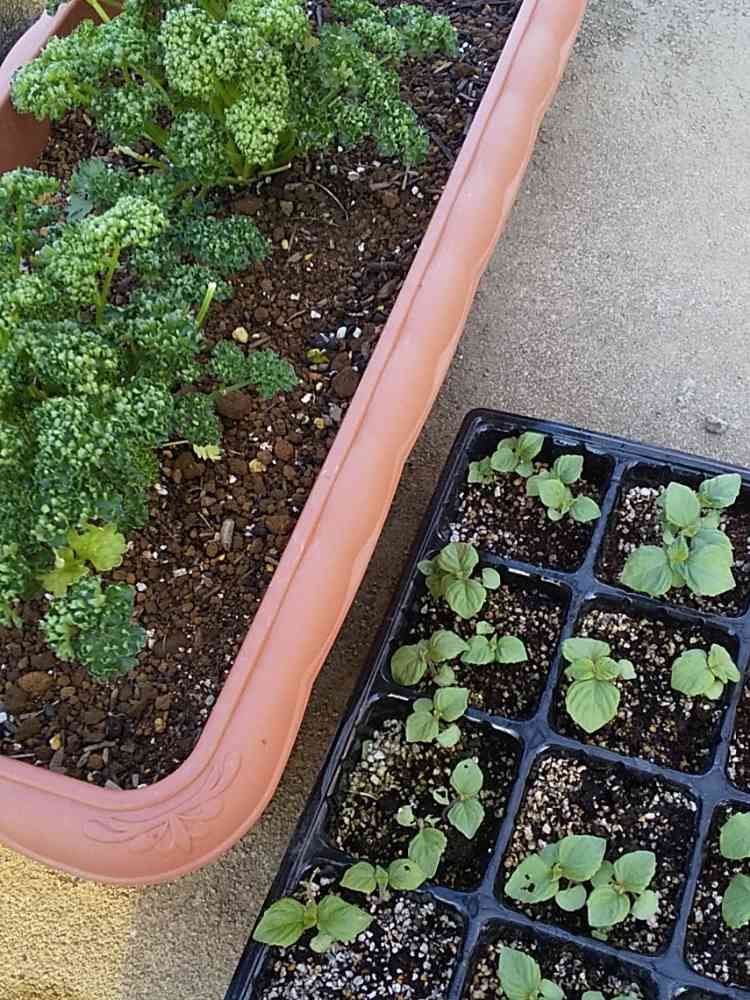 右下は撒いてから🌱が出るまで1ヶ月かかった青じそ。待ち切れなくて苗を買って植えた途端、ぞくぞくと発芽。これでも間引いた後です。
