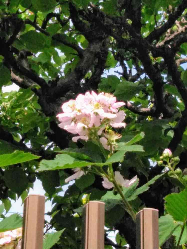 朝取れトマト🍅を買いに行った帰り道、通り道のお宅の塀のフェンスから、ブラックベリーのお花が、顔を出していました。ピンクの可愛いお花。