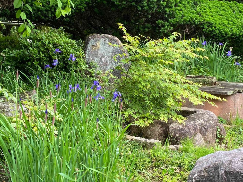 初夏のイメージの花、青いモミジに合いますが、モミジは勝手に生えてきたもの💦