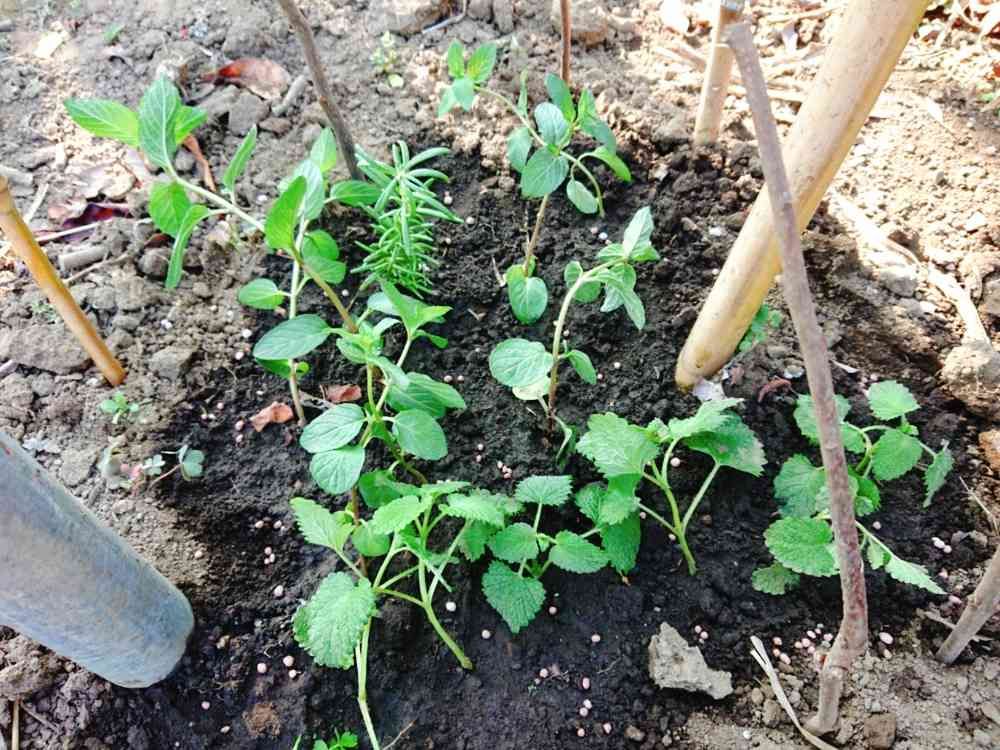 水挿しで根っこが出てきたミント・レモンバーム・ローズマリーを土へ。