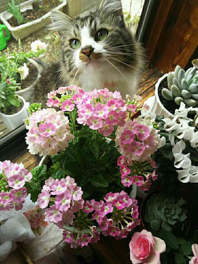 今日もかわいぃ🐱ちゃんとかわいぃバーベナ🎶