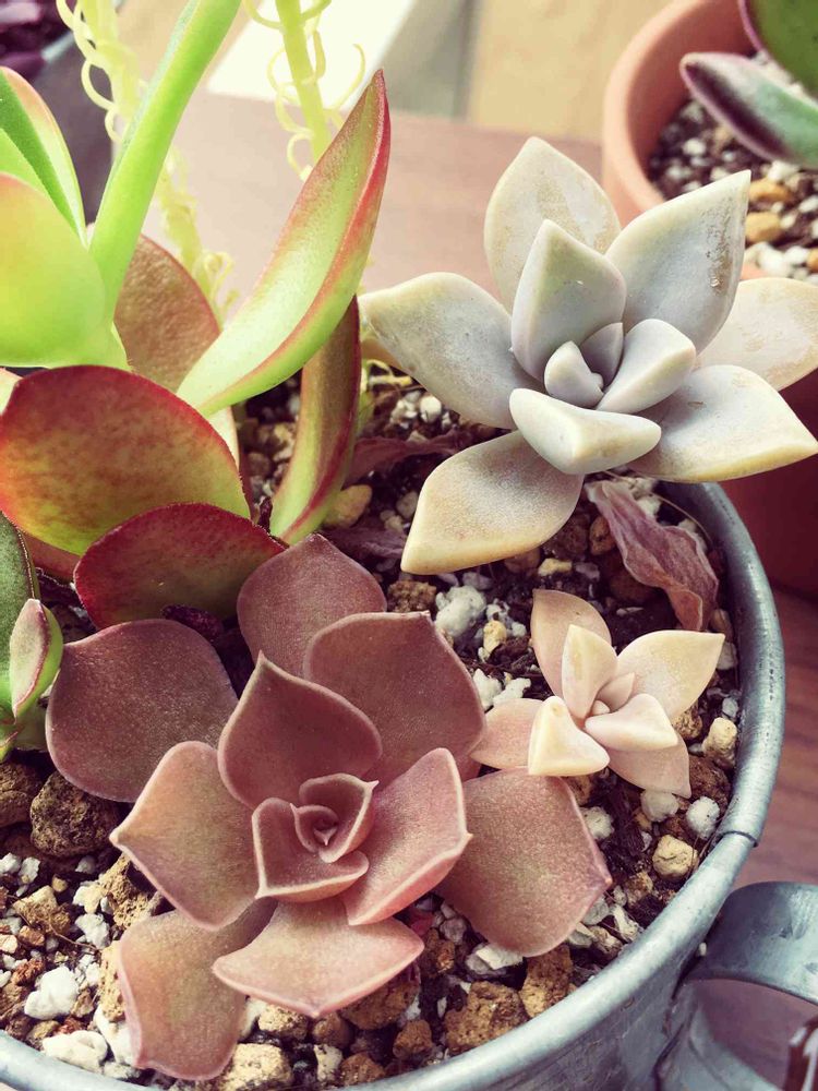 以前カット苗を買って寄せ植えしたのですが、名前不明😅 右上の子はブロンズ姫❓かなぁ。じゃ、下の子は誰だろう…