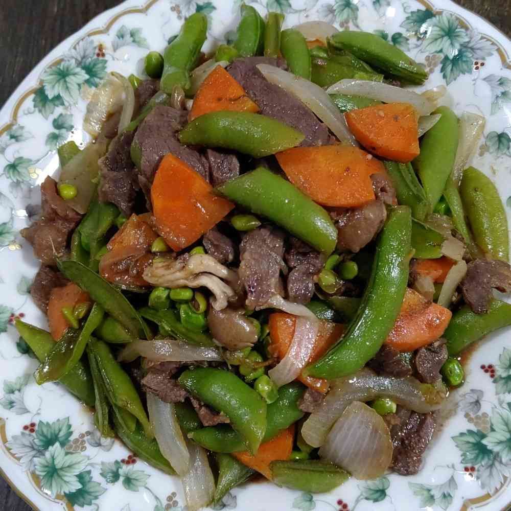 スナップエンドウ、にんじん、しめじ、新玉葱