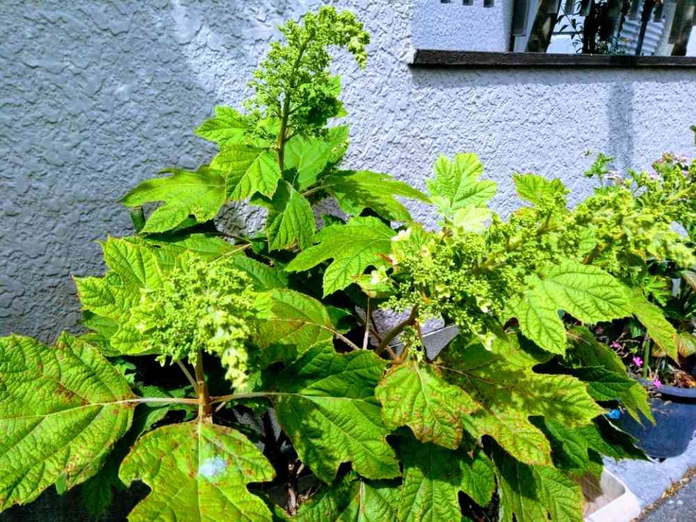 ニオイバンマツリの有るお宅です。我が家のベランダの向かいに、柏葉紫陽花が有り、楽しみにしています。