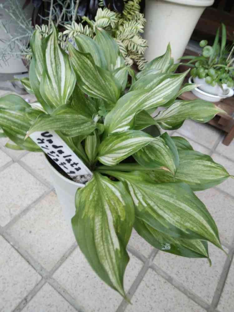 ギボウシ ウンジュラータ。メディオパリエガータとこんがらがってます。英語表記だとHosta undulata 'Mediovariegata'で同じ擬宝珠なんですけど。捻じれた真ん中が白い中斑てな意味かな?