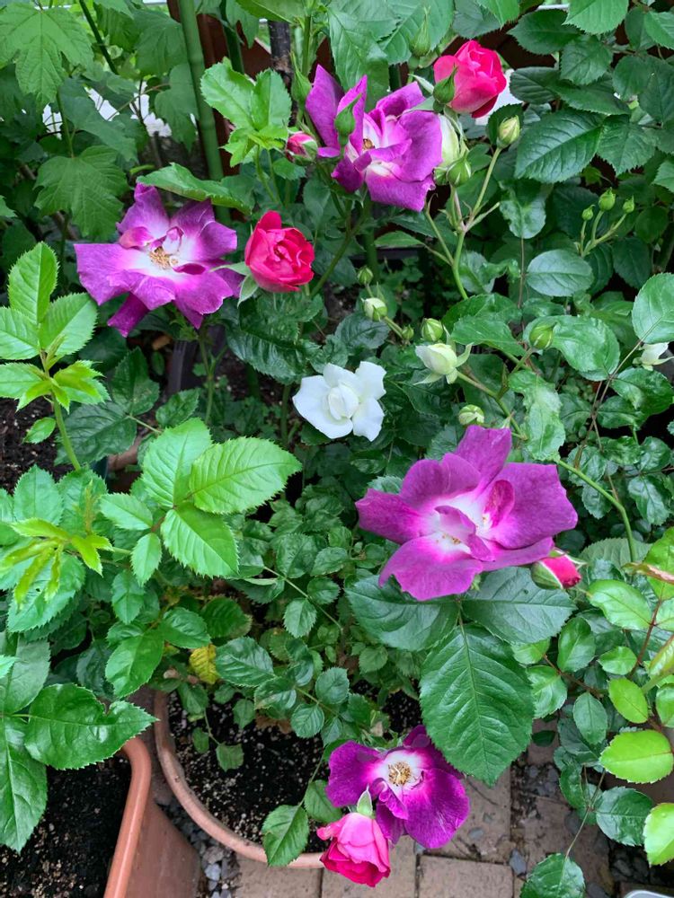 サングリアナイトさん、たくさん開花してきました。白のコケットロマンチカさんももうすぐなかんじです!