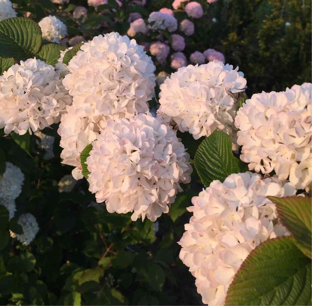 昨日の散歩先、夕陽のかかった大手毬。写真では少しだけ紫陽花のようにも見える。