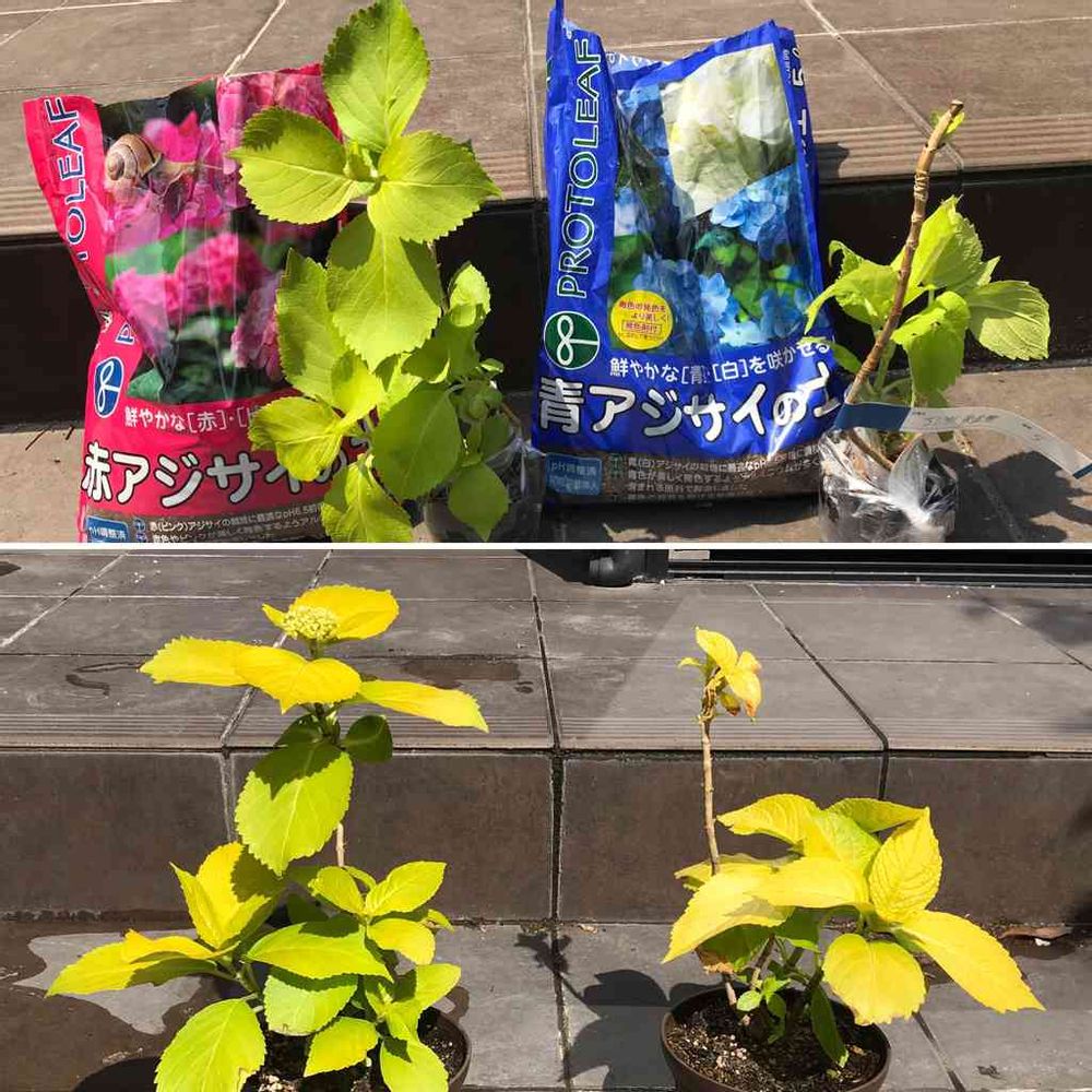 紫陽花【黄金葉】を買ったお店のHPでは「花はクリーム色から薄紫〜薄ピンクに変化します」と書いてあったので、4月16日に届いた苗2株を赤アジサイの土と青アジサイの土に植えてみました。