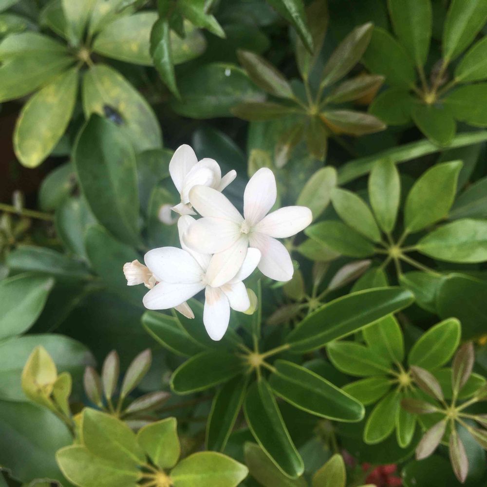 義母の鉢、カポックの間からニョッキリと伸びて咲いている、可愛いこのコはヒメヒオウギ白でした^^