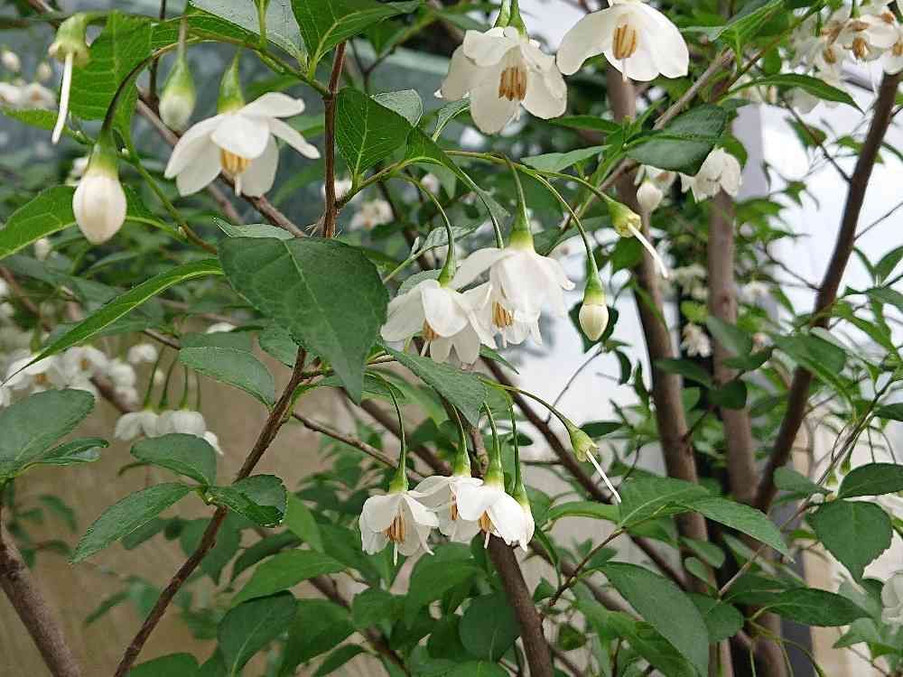 近所のマンションのエクテリアとして植えられたエゴノキの木の花