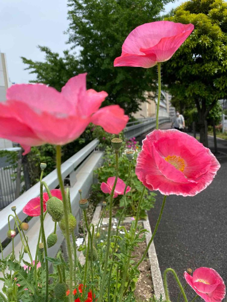 散歩のコースを変えてみましたら、跨線橋にポピーが、綺麗な花を咲かせていました。