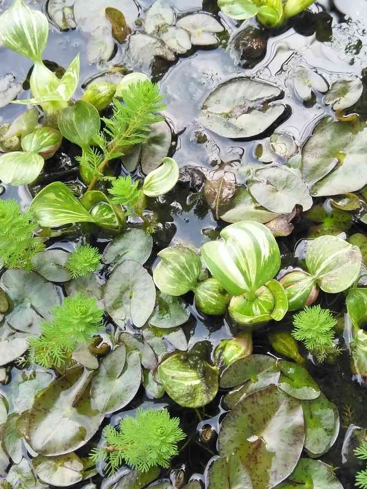 斑入りの布袋葵とオオフサモも冬を越えて芽ぶきました。メダカも元気です