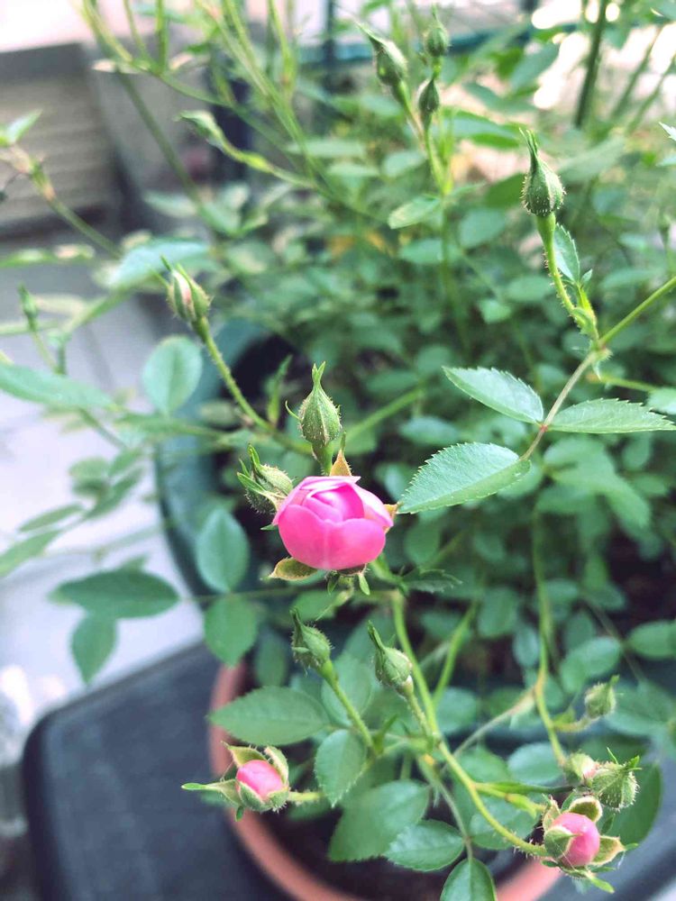 この前投稿したオレンジのミニバラとこのピンクの極小ミニバラを、2階のベランダで育てています。