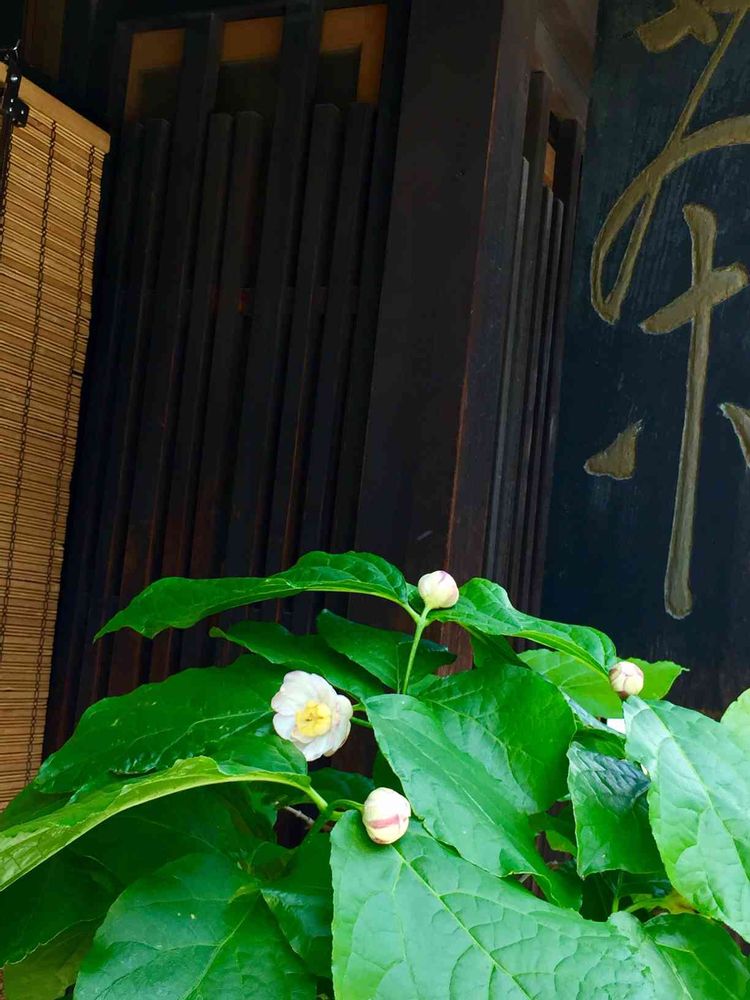 渋いお店の感じに爽やかな緑と白い花
