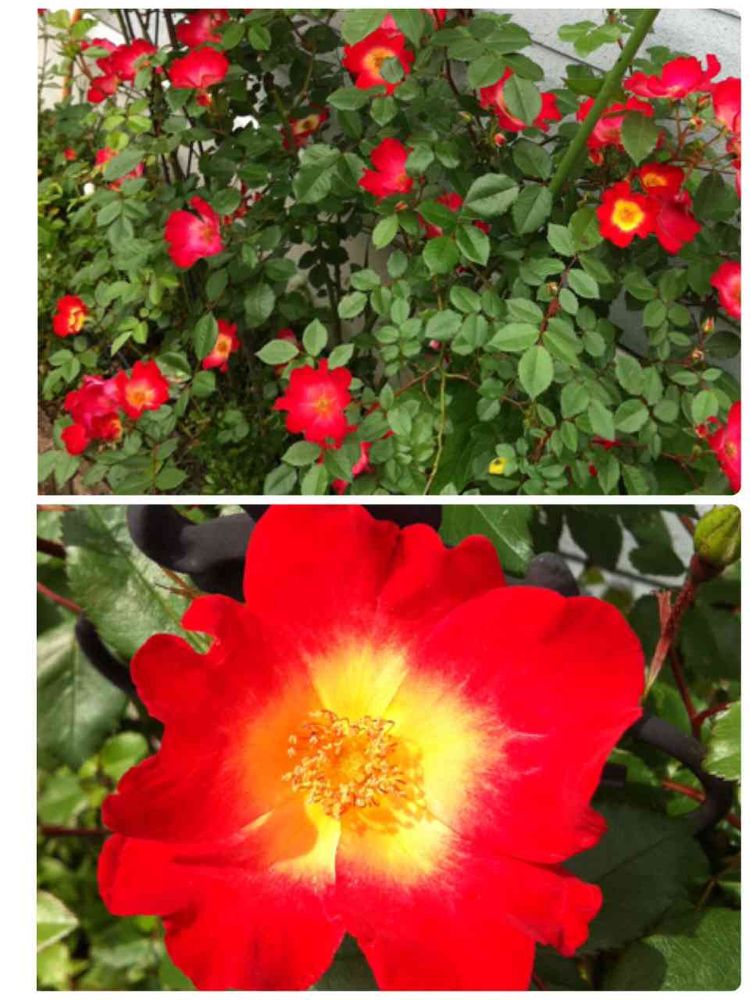 この薔薇、丈夫で、一重咲なんだけど、徐々に、中心のオレンジが回りの赤に変わって散るのよ。