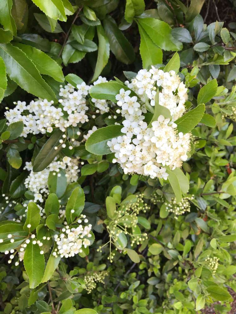 ピラカンサって、オレンジ色の実がなるのに花は白くてかわいいのですね💕
