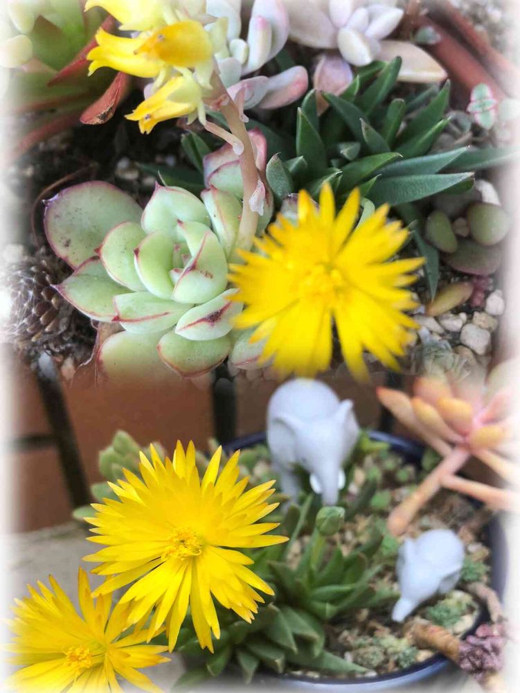 去年の春に寄せ植えした多肉たち。下の鉢は枯れた所に🐘を置き伸び放題のまま放置していました。
