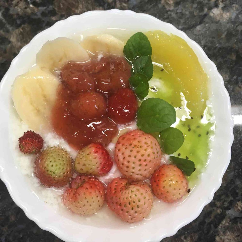 苺大量消費ヨーグルト。苺、苺ジャムにバナナ、缶パイン、キウイソース、ペニーロイヤルミント添え。