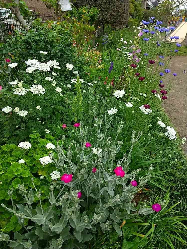 オルレア、矢車草、フランネル草、白いゼラニウムなどが花盛り。😊🎵