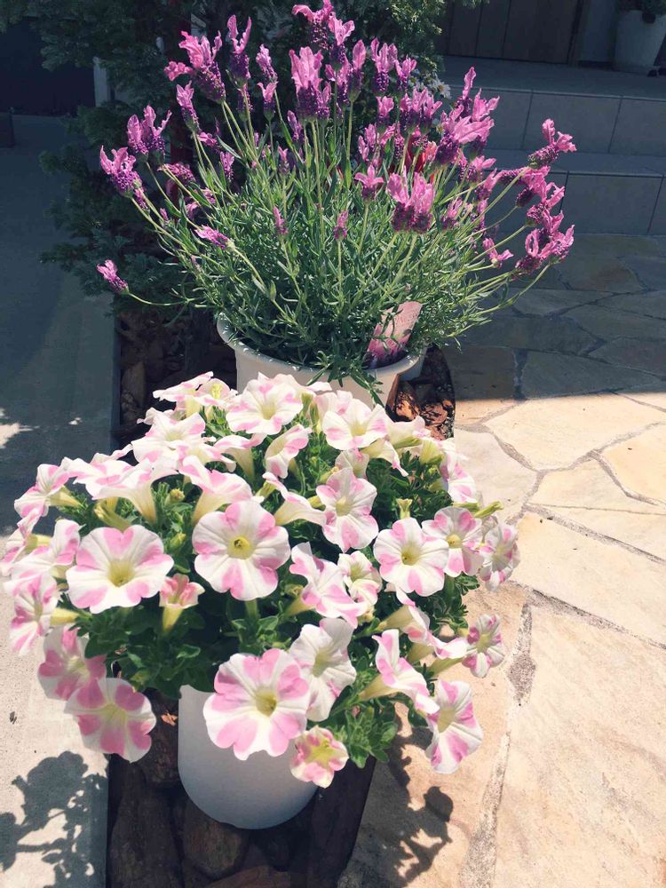 サフィニアももいろハート、フレンチラベンダーはほぼ満開に♡