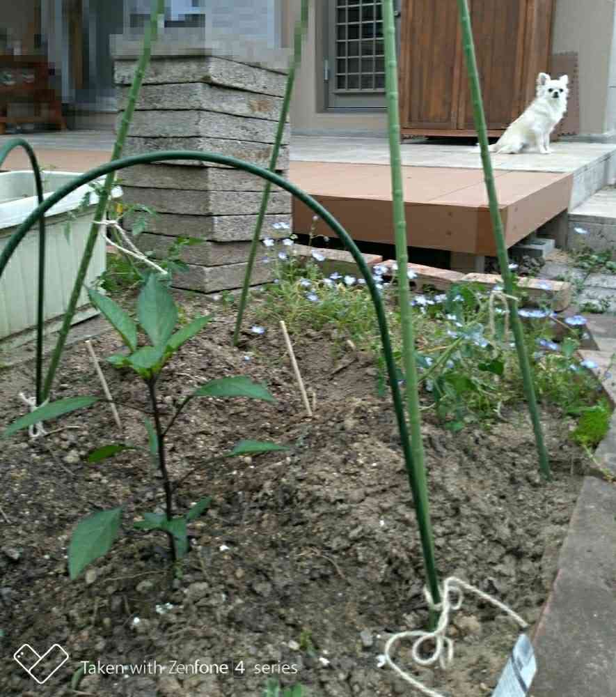 畑コーナーに苗を植えました。トマト2と、紫トウガラシ2です。