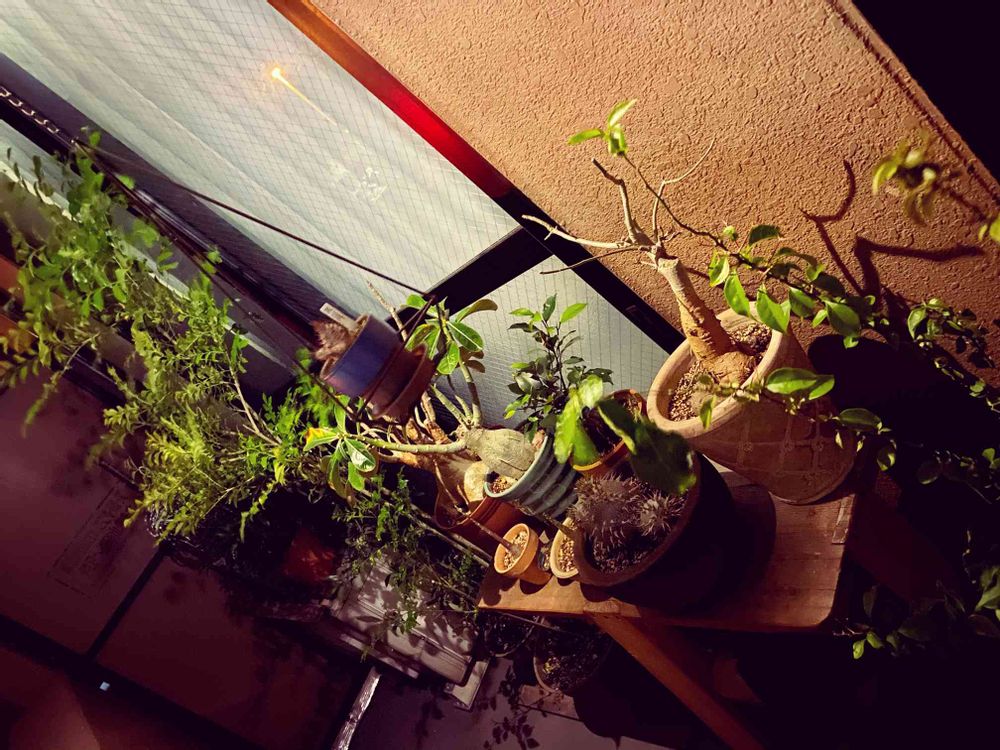 ランプを点けて、狭いベランダですくすく育った植物を愛でながらのんびり。