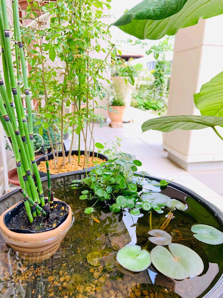 さんはじめまして、凄く素敵なテラスですね。凄く大きい鉢や素敵な植物うらやましいです。私も睡蓮みたくて小さい鉢にメダカ入れています。蓮の方は金魚です。みどりが多いと🦟蚊が多く出るので、メダカや金魚入れておくと可愛いし、蚊の発生も防いでくれるので良いですよね。