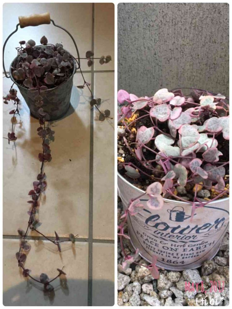 ハートカズラ錦、レディハートちゃんを少し大きい鉢へ。ずいぶんたららんとタレてきたー✧︎◝︎(*´꒳`*)◜︎✧︎˖ たまらん❤️ 新芽もたくさんでてきたよ〜。