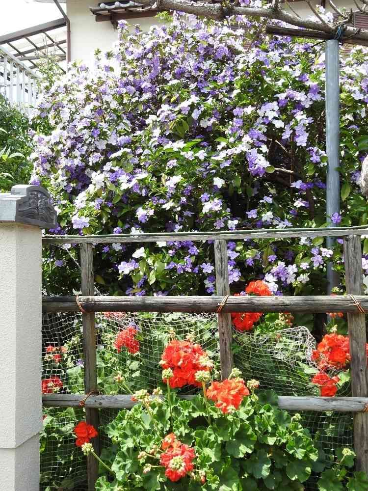 民家の庭です🌺咲き誇るニオイバンマツリと🏵ゼラニウムの花🌸