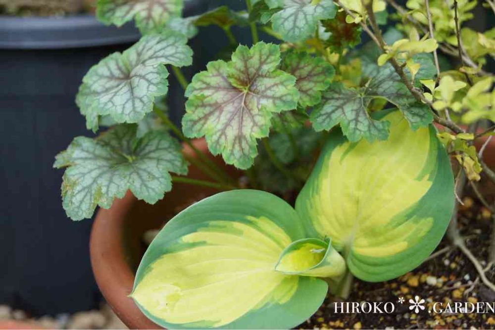 ギザギザ葉っぱは、ヒューケラです。耐寒性宿根草、強くて葉っぱが綺麗で