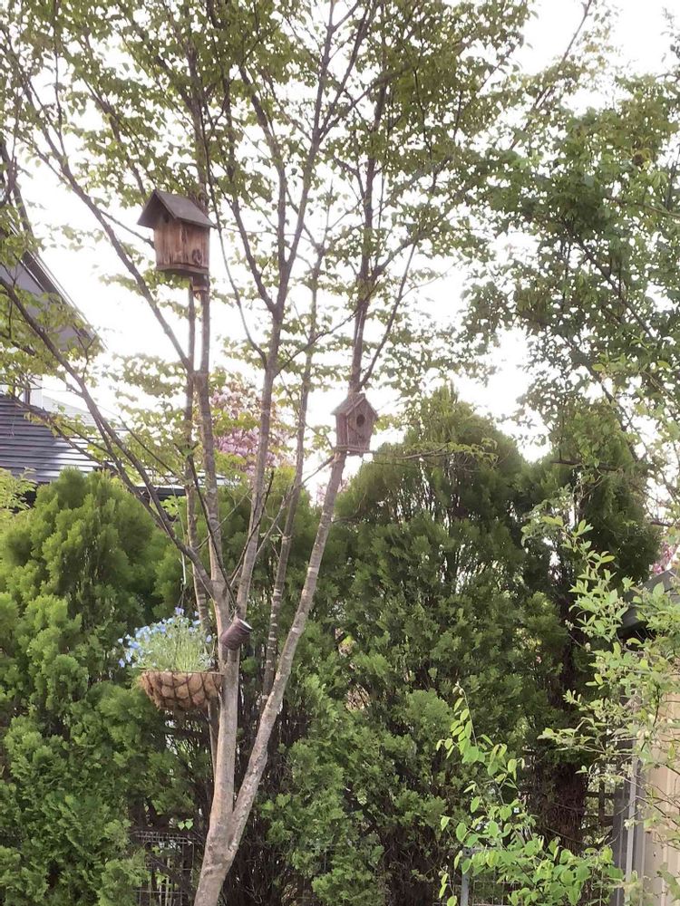 若葉と花が芽吹き始めたヤマボウシですが3年前に設置した巣箱にスズメがやっと卵産んだみたいです😄中を撮りたいですがとりあえず今はそっとしておきます。今、中で温めてると思われますが・・