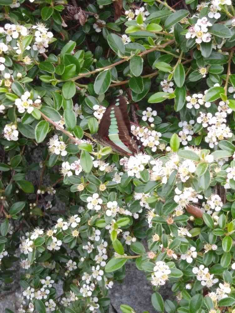 蝶々がコトネアスターの💠から蜜を集めていました❗