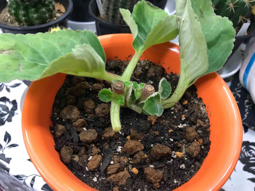 ショックです。土曜日買ったグロキシニアちゃん、植え替えました。赤色、鉢から抜く根真っ白、元気だ😊白色、鉢から抜く根真っ白、元気だ😊1番欲しかった紫色、鉢から抜く根茶色、死んでる😱土を、最小限付けて植え替え😖🌸は、あきらめ大手術、無残な姿になりました。後は、グロキシニアちゃん次第です🙏
