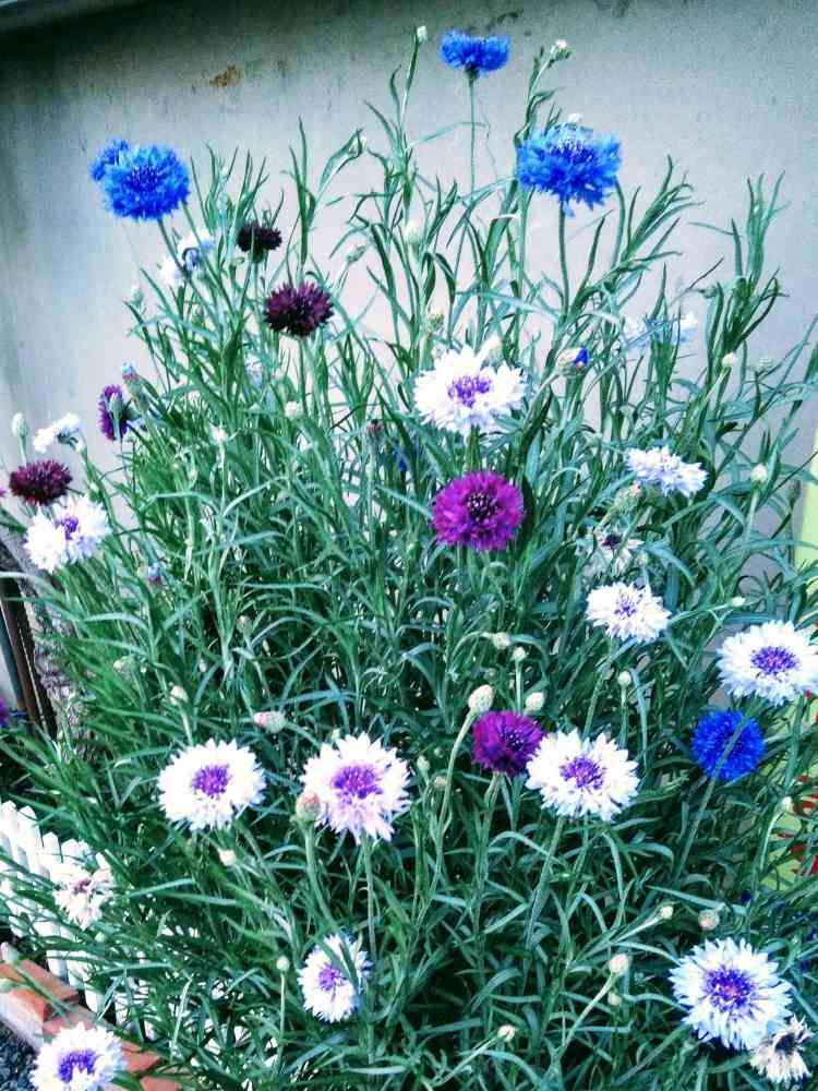散策の通り道のお宅の玄関前の花壇に、矢車草が咲いていました。