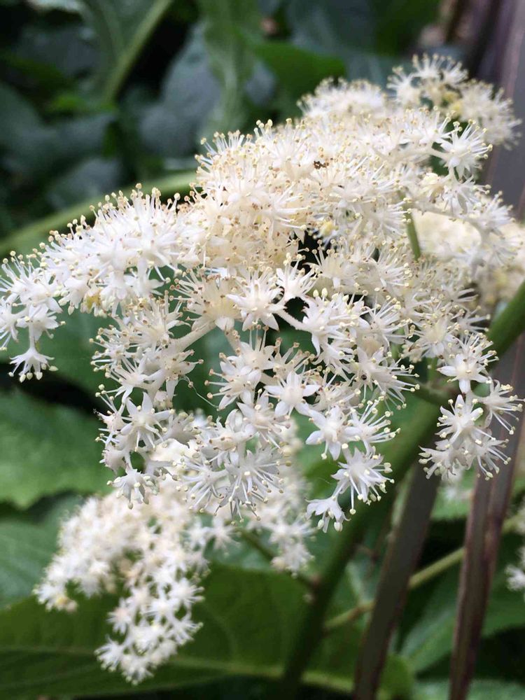 小葉 は倒卵形で先端が3~5浅裂する 花茎の高さは1mほどになり短い葉柄をもった茎葉が数個互生する。花は先端に円錐状の花序をつける 花弁はなく花弁に見える萼裂片で初め緑白色で後に白色に変わるそうです