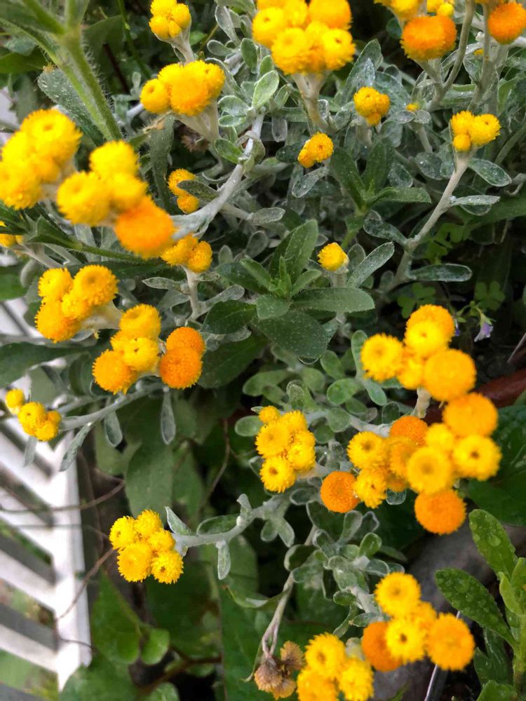 この花ヘリクリサムにも似てるんですが、カレープラントと別名があるものか、匂いがしないなら、クリソセファラムかもです🤗🍒