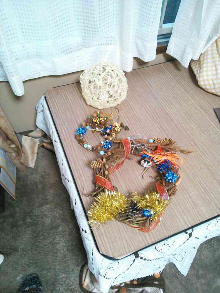 息子と作りました。ベースはサツマイモのツルですが、ドングリやヒイラキの枝やマツボックリ、そして100均アイテムで作りました。